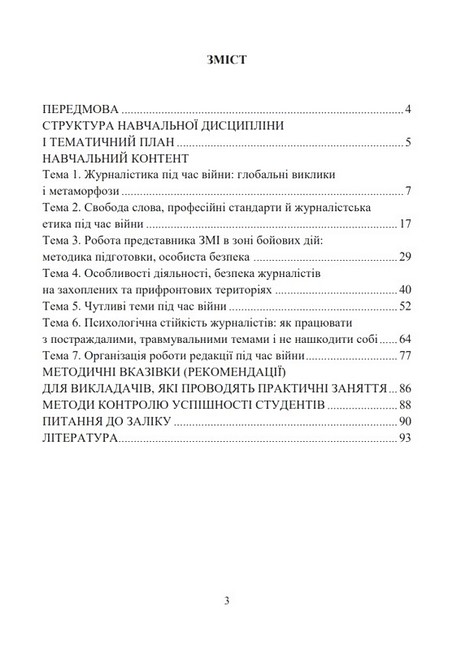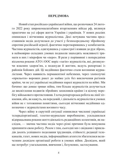 Посібник містить теоретичні відомості та контрольні запитання практично по всьому спектру навчальної дисципліни «Журналістика в умовах війни», завдання для організації самостійної роботи здобувачів, методичні вказівки та рекомендації щодо викладання курсу. Видання є одним із перших доробків навчально-методичного характеру, присвячених сучасній воєнній проблематиці, вітчизняній журналістиці в умовах широкомасштабного вторгнення військ РФ на територію України.