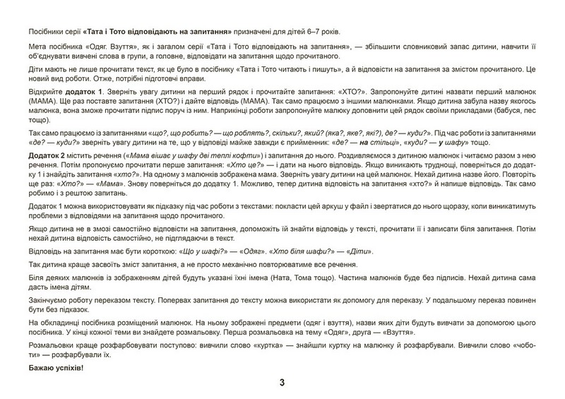 Якщо у вашої дитини виникають труднощі під час роботи з текстом, їй важко переказувати його, давати відповіді на запитання щодо прочитаного, ви можете допомогти їй, перетворивши те, що видається складним, на гру. Посібник «Одяг. Взуття» із серії «Тата і Тото відповідають на запитання» для дітей 6–7 років стане чудовим помічником батькам, які хочуть збільшити словниковий запас своєї дитини, навчити її об’єднувати вивчені слова в групи, працювати з текстом і вільно говорити про прочитане.