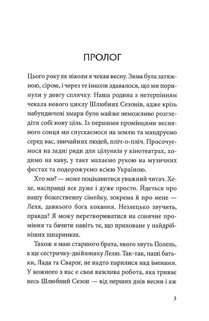 Кожне любляче серце знаходить собі пару завдяки пантеону давніх богів. З першим весняним промінням починається Шлюбний Сезон, за час якого боги намагаються об’єднати людей та допомогти їм знайти одне одного. Лише Лель вже тисячі років ставить собі за мету закохати у себе саме ту панянку, яка зарікається впустити у своє серце любов. Ця повість про життя звичайної підлітки Кіри, яка захоплюється фотографією, обожнює секонд-хенди та барахолки, а також занурена у творче життя з літературними квартирниками та вечорницями. У цій історії ми побачимо, як стикаються два світи – патріархальний, давній, просочений традиціями та усталеними порядками; а також сучасний – вільний, рівноправний та незалежний. У намаганні добитися уваги Кіри Лель буде потрапляти у різні кумедні ситуації: потовчеться у черзі на завозі в секонд-хенді, віднайде унікальний скарб серед барахолки на Почайній, долучиться до когорти талановитої молоді та постане перед складною дилемою – лишатися богом та відпускати Кіру, віддавши ключ від її серця іншому? Чи бути людиною, позбувшись здатності обертатися на сонячне проміння, стати смертним?