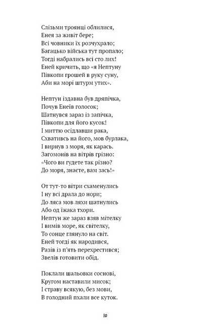 Еней увірвався в український культурний простір на порубіжжі XVIII–XIX століть і змінив геть усе. На те він і Герой! Виявилось, античний персонаж може мати вигляд і діяти як український козак, а повір’я, традиції, гумор, багата народна мова — наповнити класичний верґіліївський сюжет новими сенсами! Іван Котляревський прийняв виклик тогочасного суспільства і виграв! А разом із ним і читачі, які уже майже 200 років мають змогу насолоджуватися яскравими образами, карколомними пригодами і нетривіальним гумором.