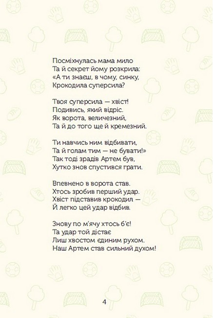 Крокодильчик з суперсилою» — це збірка з 11-ти теплихвіршованих історій, створених з любов’ю до дітей та їхніх мрій. Тут крокодил Артем віднаходить віру в себе та стає легендою дворового футболу, Славко жирафа вчиться слухати маму та їсти фрукти, мавпочка Людмила відкриває чарівний світ без гаджетів, а ведмежа Льоша слідує своїй мрії та стає щасливим вправним льотчиком. Серед героїв — і тендітна черепашка, і бешкетна білочка, і навіть справжній котячий музичний бенд.