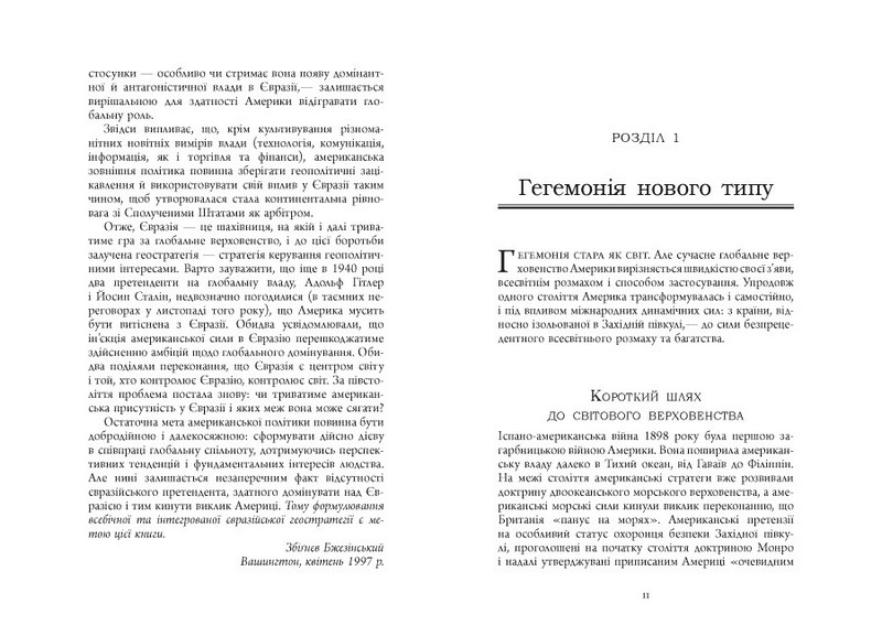 У своїй гострій книжці Збіґнев Бжезінський дає відповідь на це питання. «Велика шахівниця» відображає сміливе і провокаційне геостратегічне бачення автором американського переважання у XXI столітті. Центральним у його аналізі є здійснення влади на євразійському ландшафті, де проживає найбільша частина населення земної кулі; природні ресурси та господарська діяльність. Завдання, що стоїть перед Сполученими Штатами, стверджує він,— керувати конфліктами і відносинами в Європі, Азії та на Близькому Сході, щоб не виникло жодної країни-суперниці.
