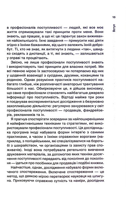 Що може змусити кожну людину сказати «так»? Як переконувати людей та уникати небажаного впливу? Відповіді шукайте на сторінках цієї книги, яка миттєво стала світовим бестселером. Її автор описує методи й закони психологічного тиску й створення конкуренції. Використовуючи яскраві приклади з життя, Роберт Чалдині дає унікальні поради, як викорінити в собі синдром жертви й не потрапити на гачок нав’язливої реклами, а також навчитися самому переконувати й здобувати бажане.