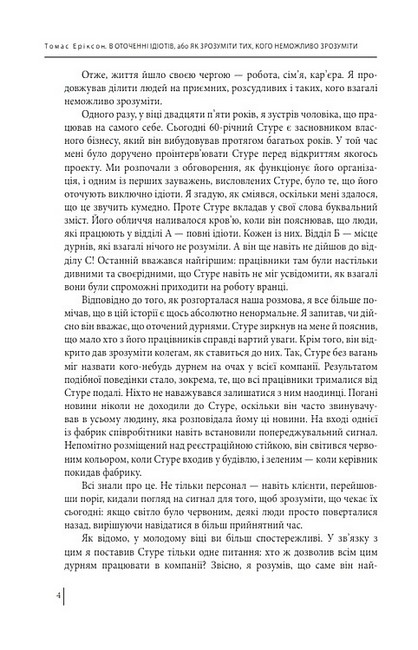 «В оточенні ідіотів» — бестселер 2015—2018 років. Томас Еріксон поділяє людей на чотири кольорові типи. Він описує логіку поведінки, темперамент, систему цінностей представників кожного з кольорів. Чому одних людей ми розуміємо з півслова, а інших не розуміємо взагалі? Чому дуже успішні люди інколи здаються нам ідіотами і психопатами? Як подивитися на себе очима інших людей і навчитися розуміти навіть тих, хто на нас абсолютно не схожий?