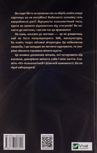 Психологічна нон-фікшн література з елементами самодопомоги. Ідеально підійде для жінок, які перебували або перебувають у складних стосунках, прагнуть зрозуміти себе краще, і для всіх, хто хоче навчитися здорового кохання — без болю, страху та самопожертви.