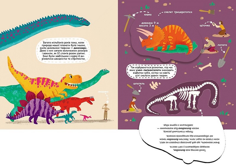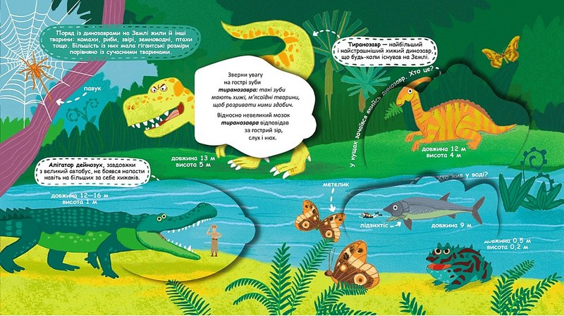 Ця книжка є справжньою енциклопедією життя динозаврів, які мешкали на нашій планеті в загадкові доісторичні часи. Мандруйте сторінками книжки: проберіться крізь зарості папороті та хвоща, зазирніть у підводний світ моря або посидьте на високій скелі, щоб познайомитися з цими цікавими тваринами та їхніми не менш дивовижними сусідами. Не забувайте відкривати віконця, щоб не пропустити найцікавіше!