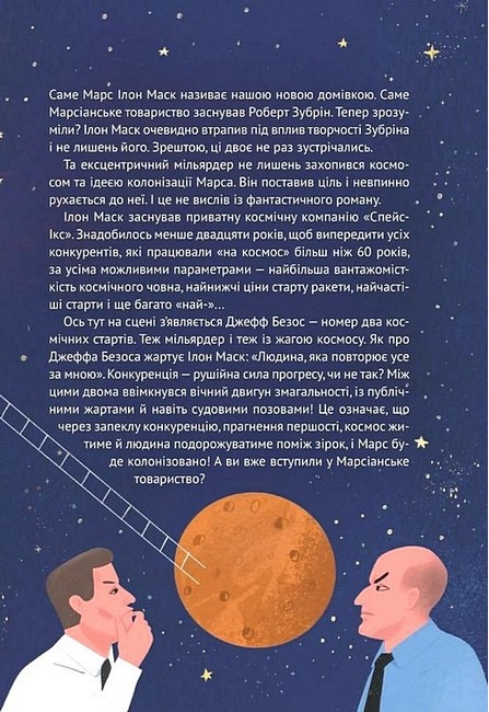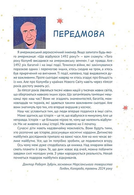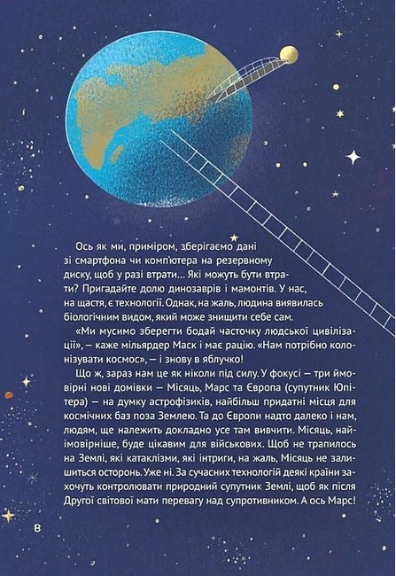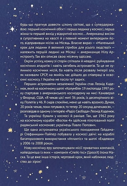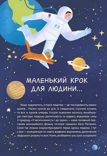 Ти переглядаєш сторінку цікавезної книжки про космос, а також про людську допитливість і сміливість. Читаючи її, ти крок за кроком, сторінка за сторінкою заглиблюватимешся у Всесвіт із його незліченними таємницями й загадками. Це будуть незабутні позаземні мандри з героями книжок і фільмів про космос.