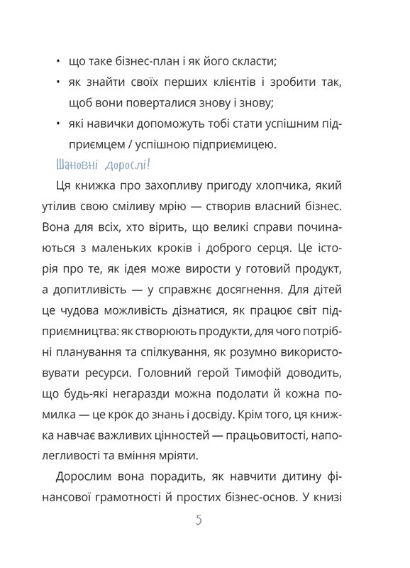 Ця книжка для всіх, хто вірить, що великі справи починаються з маленьких кроків і доброго серця. Для дітей це чудова можливість дізнатися, як працює світ підприємництва: як створюють продукти, для чого потрібні планування та спілкування, як розумно використовувати ресурси.