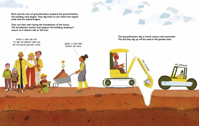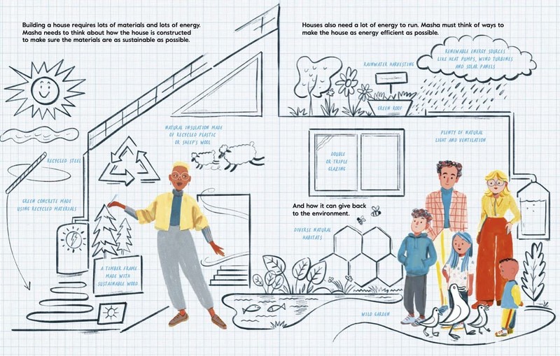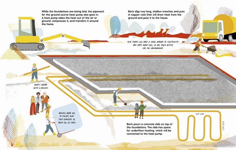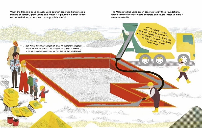 The Mellons Build a House - це надзвичайно приємна книжка з малюнками, яка крок за кроком проводить читача через проектування та будівництво будинку. Теплові насоси, сонячні панелі, ізоляція та збір дощової води пояснюються та втілюються в життя на теплих ілюстраціях Ніка Невеса.