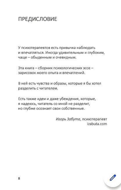 Психотерапия учит впечатляться очевидным, танго – чувствовать жизнь телом. Эта книга – сборник из 50 психологических эссе, написанных не столько из головы, сколько из сердца, с иронией, любовью и грустью, «прекрасная ересь» от «танцующего психотерапевта» Игоря Забуты, автора книг «Танго глазами танцующего психотерапевта. Обними меня» и «Танго на кушетке. Обнять себя».