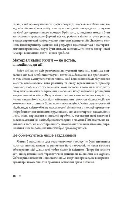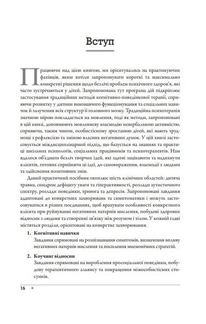 Книга є збіркою вправ для підкріплення традиційних методів когнітивно-поведінкової терапії та сприяє розвитку у дитини соціальних навичок. На відміну від традиційної психотерапії у цій книзі мовленнєва взаємодія доповнюється невербальною активністю, сприяючи особистісному зростанню дітей, які мають труднощі з рефлексією та зміною негативних думок. В основу книги покладено знання та досвід шкільних психологів, соціальних працівників та психотерапевтів.