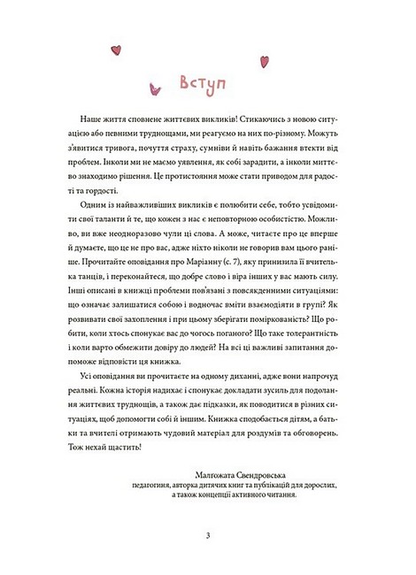 Дванадцятеро авторів написало дванадцять історій про життєві виклики. Зображаючи яскравих персонажів та їхні повсякденні переживання, вони намагалися відповісти на питання, як навчитися долати труднощі. До книжки ввійшли оповідання про самооцінку, агресію, толерантність, небезпеку, яка чатує на дітей в інтернеті, зосередженість, захоплення, зловживання мобільними пристроями, суперництво, маніпуляцію, надчутливість, соціальний тиск і сором’язливість.