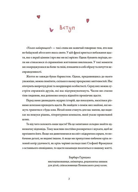 Група авторів і авторок написала дванадцять оповідань про те, як навчитись насолоджуватися кожним днем. Адже щастя — це не лише здійснення найзаповітніших мрій. Воно також приховане у дрібницях. У книжці зібрано оповідання про родинні ритуали, єдність, розвиток свого хобі, радість від дрібниць, суперздібності, допомогу іншим, стосунки з рідними та друзями, здійснення мрій, досягнення мети та вдячність.