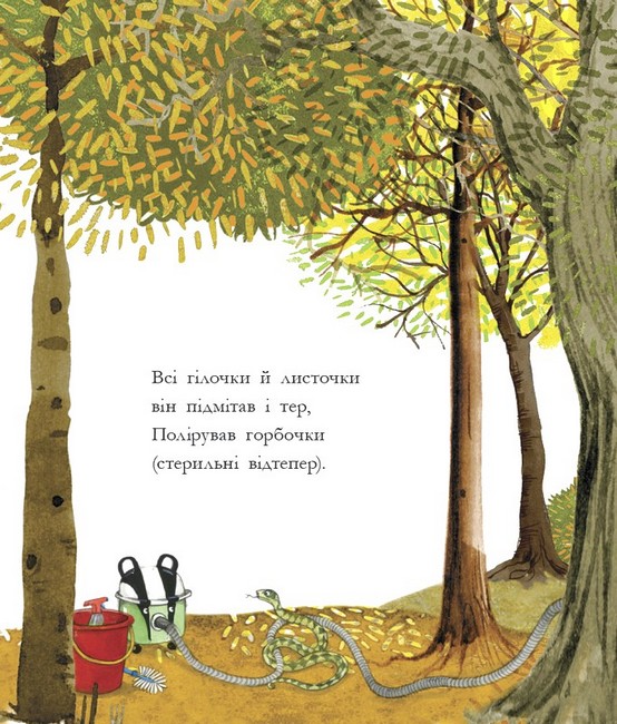 Книга розповідає про борсука Піта, який обожнював чистоту. Цілими днями він лише те й робив, що наводив лад у лісі. І ось, коли всі звірі були чистими, а навколо був цілковитий порядок… Піт знайшов опалий листок! А потім ще один і ще! Скажете, що це дрібниці? Тільки не для Піта…