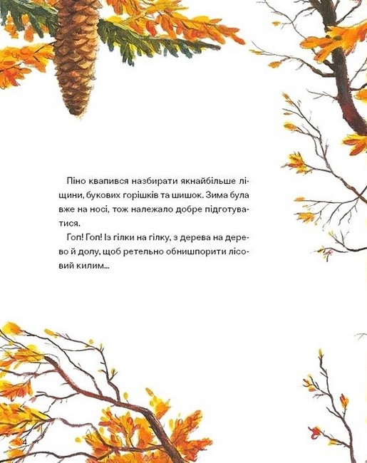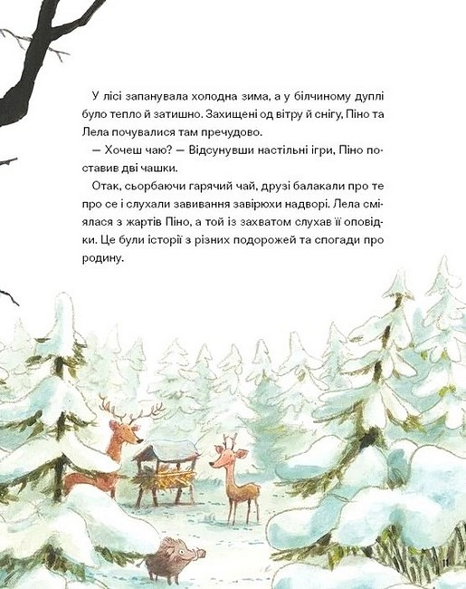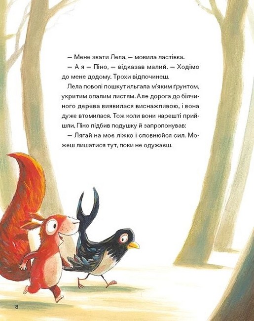 Піно — білченя. Одного разу малюк сумлінно збирав їжу на зиму, аж раптом в око йому впало щось дивне на дереві. Ластівка! Її було поранено, і вона застрягла між гілок. Звісно, Піно вирішив допомогти горопашній і обережно вивільнив її. А потім запросив до себе на гостину, почастував гарячим чаєм, ба навіть запропонував своє ліжко. З того й почалася історія надзвичайної дружби білченя Піно й ластівки Лели.
