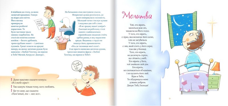 У книжці є 12 частин, у яких поступово пояснюється «Символ віри». Кожна з них містить діалог дитини й тата, тематичне оповідання, короткі висновки і молитву.