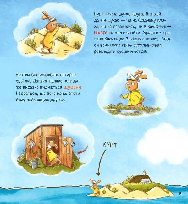Щуреня Івве живе на острові посеред моря. Івве обожнює гомін штормів, піщані дюни та свій старий маяк. Кроленя-капітан Курт живе на іншому острові посеред моря. Курт обожнює солоне повітря, свій рибальський будиночок і велику зелену дамбу. І вони обидва почуваються досить-таки самотньо... Чи не круто було б поділитися з кимось своїми захопленнями? Із другом? Але що ж робити, якщо дружба вже майже на носі й водночас так далеко? Треба гарненько поміркувати…