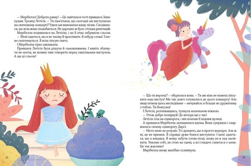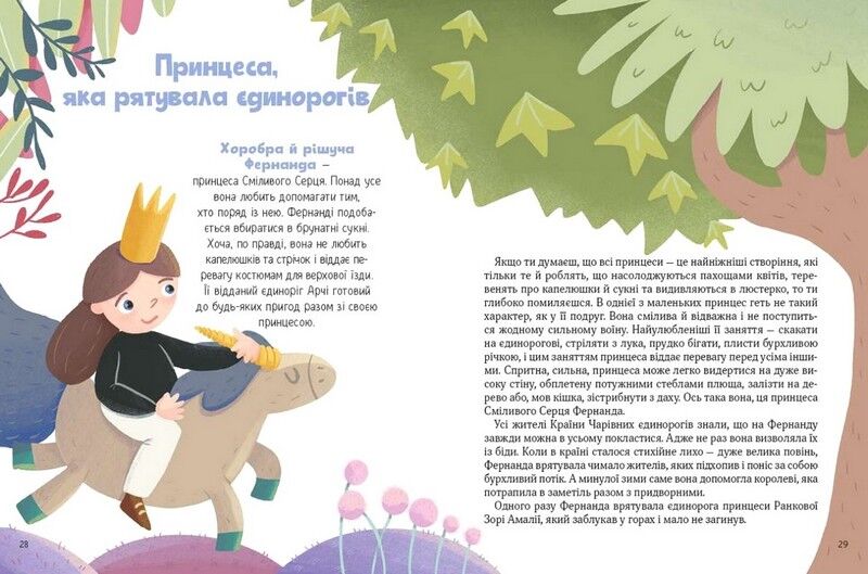 Ще мить — і ви розгорнете цю чудову книжку. І почнеться чарівна, дивовижна казка. У ній є прекрасні принцеси — сором’язливі й безстрашні, мрійливі й відважні. А в кожної з них є улюблений єдиноріг. Чарівні й мудрі створіння допомагають принцесам долати перешкоди, разом із ними стають сміливішими, спритнішими та чуйнішими. Принцеси ще зовсім маленькі, але серця в них великі й добрі. Адже це так важливо — не тільки плекати любов і доброту, а й щедро ділитися з тими, хто поряд.