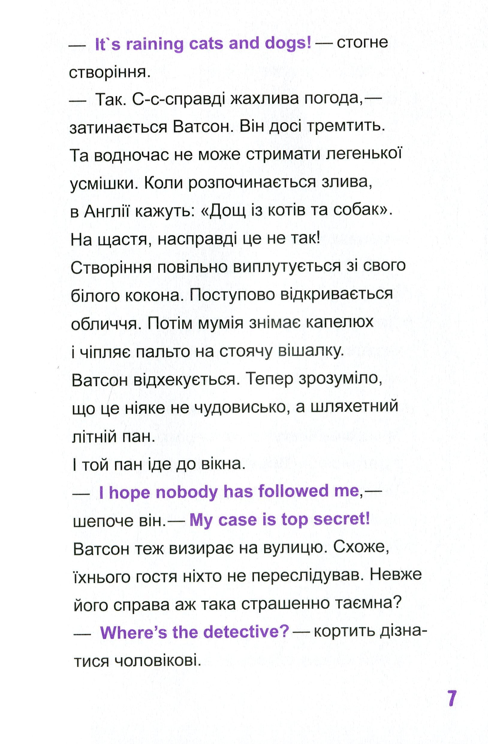 Attention, рlease! Ця захоплива книжка — справжній скарб для батьків і дітей. Детективні пригоди, цікаві головоломки, вивчення перших слів і висловів англійською для читачів молодшого шкільного віку, а також справжня дружба й неймовірні пригоди — усе це на її сторінках. Майже всі люди на Землі знають, хто такий Шерлок Голмс. Але не всі знають, що в нього є не менш талановитий нащадок — Шерлок Голмс П’ятий.