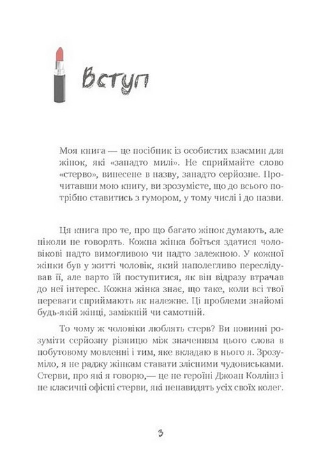 Минуло кілька тижнів або місяців, і ви помічаєте, що його інтерес до вас згаснув. Не поспішайте купувати нову білизну або готувати розкішну вечерю з чотирьох страв. Світовий бестселер Шеррі Аргов «Чоловіки люблять стерв» - це посібник для дуже хороших жінок, які старанно «працюють над стосунками». З книги ви дізнаєтеся, чому ваші старання дають зворотний ефект і що насправді збуджує всіх чоловіків без винятку. 100 принципів привабливості, які сформулювала для вас Шеррі, допоможуть вам завжди залишатися для нього жінкою мрії, яку необхідно добиватися знову і знову. І ви зможете розвивати ваші стосунки за своїм власним сценарієм.