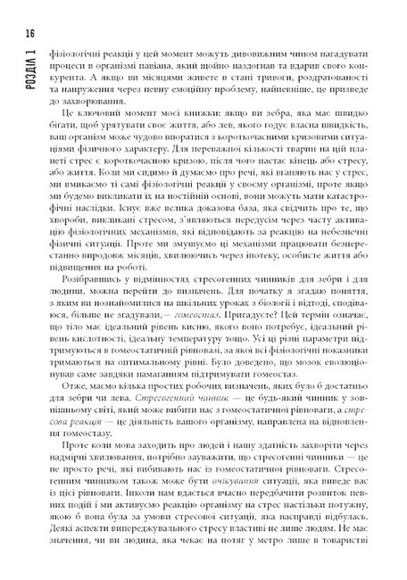 Усі хвороби — від стресу. Чули таке? Роберт Сапольські, професор біології та нейрології Стенфордського університету, вирішив це перевірити. У цій книжці зібрані результати багатьох досліджень, виконаних вченими з різних галузей. Стрес і реакція організму на нього залежить від безлічі чинників, наприклад, від того, що їла ваша мама під час вагітності. Серйозну тему авторові вдалося подати без зайвої академічності, а терміни з’являються лише там, де це конче необхідно. Це корисна книжка для тих, хто прагне краще розуміти себе і своє тіло, але не хоче витрачати час на боротьбу зі спеціальною літературою. Зрештою, легкий стиль пана Сапольські робить читання напрочуд приємним.