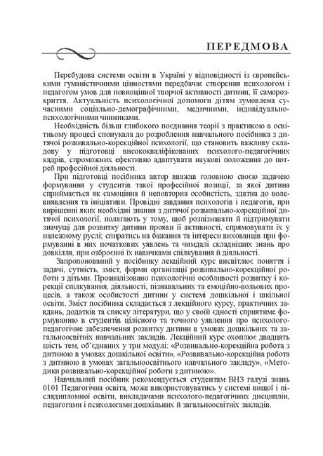 У навчальному посібнику розглянуто поняття і задачі розвивально-корекційної психології, розкрито теоретичні основи і прикладні питання розвивально-корекційної роботи з дітьми на різних етапах їх соціалізації. Проаналізовано психологічні особливості розвитку і корекції спілкування, діяльності, пізнавальних та емоційно-вольових процесів, а також особистості дитини у системі дошкільної і шкільної освіти. Зміст посібника складається з текстів лекцій, практичних завдань, додатків та списку літератури.