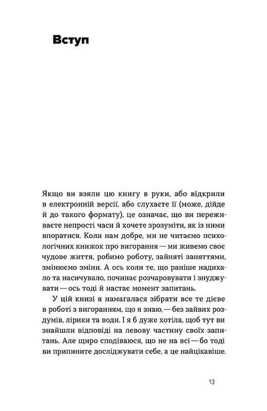 Ця книга не просто пояснює теорію — вона пропонує дієві інструменти: вправи самоспостереження, короткі практики, питання для роздумів і стратегії відновлення. Ханна Руденко поєднує професійний досвід з теплою, людяною манерою письма, тому кожна порада звучить не як інструкція, а як підтримка друга, який хоче вашого спокою. Це той випадок, коли нонфікшн читається легко, але впливає глибоко.