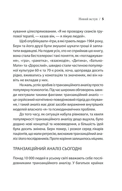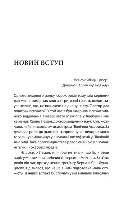 «Ігри, у які грають люди» — світовий бестселер, який видається десятиліттями. Вона поєднує психологічну глибину з дивовижною простотою викладу. Берн не нав’язує, а пояснює. Його теорія допомагає зняти маски — свої й чужі — і побачити, що за ними ховається. Це книжка, яку перечитують і передають з рук у руки. Вона — про всіх нас. І вона справді працює.