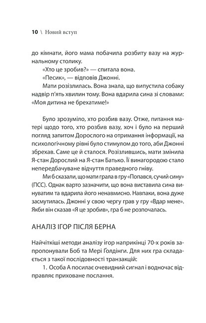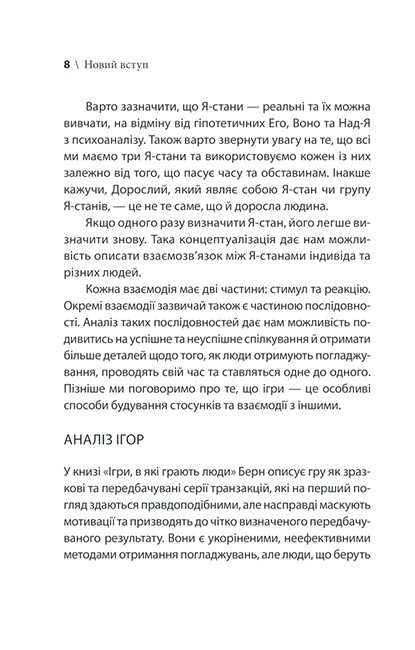 Ця книжка не просто перевертає уявлення про спілкування — вона розкриває таємниці того, як ми живемо, любимо, сваримося, працюємо. Ерік Берн — психіатр і творець транзакційного аналізу — описує людські взаємодії як психологічні ігри з визначеними ролями. Від «Бий мене» до «Подивись, як я стараюся» — ми всі граємо, навіть не підозрюючи цього. І тільки усвідомлення гри дає шанс змінити сценарій.