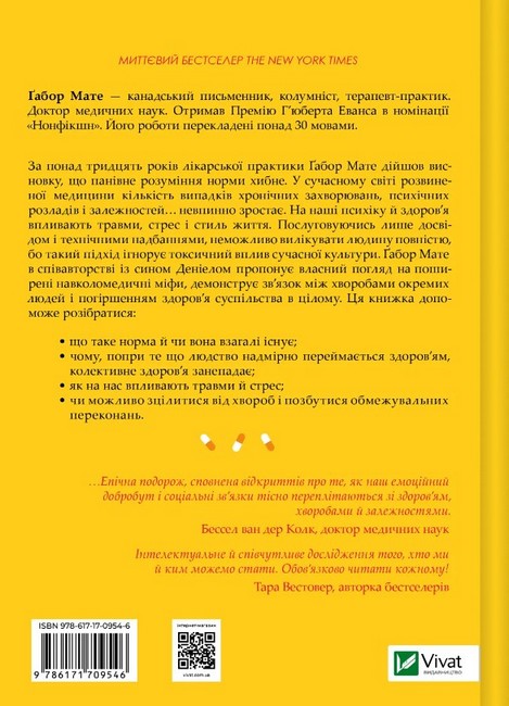За понад тридцять років лікарської практики Ґабор Мате дійшов висновку, що панівне розуміння норми хибне. У сучасному світі розвиненої медицини кількість випадків хронічних захворювань, психічних розладів і залежностей… невпинно зростає. На наші психіку й здоров’я впливають травми, стрес і стиль життя. Послуговуючись лише досвідом і технічними надбаннями, неможливо вилікувати людину повністю, бо такий підхід ігнорує токсичний вплив сучасної культури. Ґабор Мате в співавторстві із сином Деніелом пропонує власний погляд на поширені навколомедичні міфи, демонструє зв’язок між хворобами окремих людей і погіршенням здоров’я суспільства в цілому. Ця книжка допоможе розібратися: