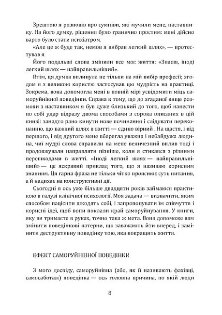 Практична книга від досвідченого психіатра і автора бестселера «Як розмовляти з мудаками» про те, як боротися з 40 проявами саморуйнівної поведінки — від прокрастинації до гніву. Аналізуючи своє життя, багато людей з жалем усвідомлюють, що вони мало схожі на те, про що вони мріяли, на що сподівалися. Ще сумніше розуміти, що нездатність реалізувати надії і мрії в значній мірі обумовлена тим, що ви самі були головною перешкодою. А точніше, ваша саморуйнівна поведінка. Ось чому так важливо навчитися визначати власні моделі самосаботажу і відмовитися від усіх форм його прояву. Не зробивши цього, ви серйозно ризикуєте пережити в майбутньому найглибше розчарування як через втрачені можливості, так і з-за невипробуваного задоволення життям і недоотриманої або недоданої любові. Цю книгу варто прочитати від кірки до кірки, а потім використовувати в якості довідкового посібника. Відкриваючи її, коли у вашому житті виникнуть складні ситуації і вам знадобиться рада зі зміни конкретної моделі саморуйнівної поведінки.