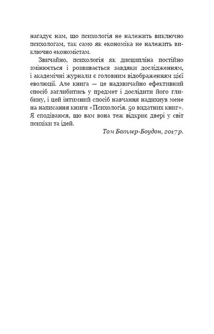 Том Батлер-Боудон — відомий у всьому світі популяризатор науки — під однією обкладинкою зібрав основні ідеї, концепції та методики різних напрямків психології. 50 книг найвидатніших психологів — від Зиґмунда Фройда й Карла Ґустава Юнґа до Деніела Канемана й Керол Двек — він переказав доступною мовою, зумівши на кількох сторінках викласти зміст твору, передати основну думку та прокоментувати його вплив на розвиток науки. Книга Тома Батлер-Боудона допоможе скласти уявлення про різні галузі психології, визначити напрямок, який цікавить вас найбільше, й підкаже, які книги варто прочитати, щоб глибше зануритися в захопливі глибини «науки про душу».