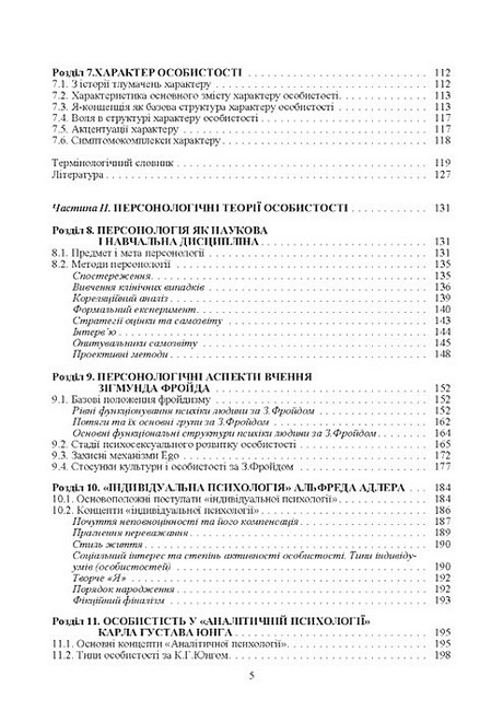 В І-й частині викладено найбільш істотні властивості особистості як психологічного феномена, що формується і функціонує в суспільстві. Розкрито сутність її біологічної (генетично зумовлених психічних властивостей), суспільної та духовної природи. Показано: кореляції між конституційно-антропометричними та психічними властивостями людини; основний психологічний зміст задатків, здібностей, темпераменту, характеру; закономірності мотиваційної динаміки стосунків між особистістю і суспільством; соціально-психологічні механізми формування і функціонування особистості; сутність екзистенційних особистості (Втечі в Натовп, Втечі від Свободи, Втечі від Абсурду); основний психологічний зміст духовності, моральності, совісті, любові до ближнього, утилітарної мотивації доброчинності, екзистенційного відчаю, віри в Бога як духовного вибору особистості. У ІІ-й частині. висвітлено основний зміст тих теорій особистості, які утворили модерну гуманістичну парадигму в психології: психоаналізу З.Фройда.
