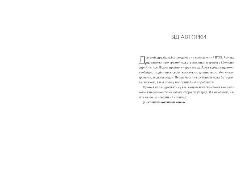 Стефані Фу потерпала від психологічного й фізичного насильства з боку батьків та була покинута ними у підлітковому віці. Після років консультацій Стефані дізналась, що її панічні атаки та проблеми в стосунках у дорослому віці спричинені комплексним посттравматичним стресовим розладом, який виникає, коли травма накопичується протягом багатьох років. Фу описує свій шлях зцілення та методи, до яких зверталась. Болісна й водночас надихаюча, ця книга є потужною терапевтичною розповіддю. Стефані доводить: віднайти себе та повірити у власну цінність після травми — можливо.