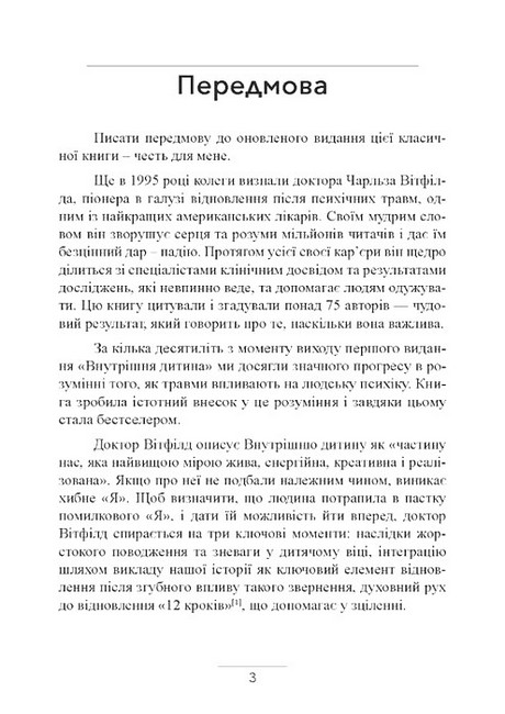 Перше видання найавторитетнішої книги про Внутрішню дитину українською мовою. Ця частина особистості є у кожного, і в багатьох вона травмована. Лікар-психотерапевт Чарльз Вітфілд буквально за руку веде читача до одужання — через оплакування своїх прихованих ран з минулого, вирішення внутрішніх конфліктів та глибинних проблем до прийняття себе та душевного благополуччя.