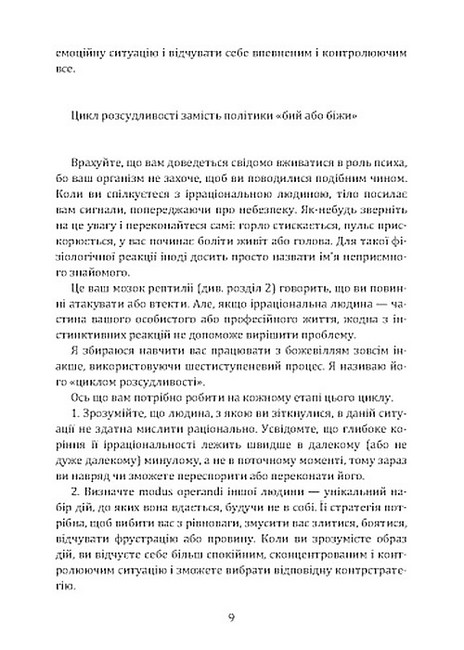 Всі ми періодично зустрічаємося з людьми, з якими конструктивна розмова неможлива. Як з ними бути? Як розмовляти з тим, хто взагалі неконтрольований? У цій книзі відомий психіатр і консультант Марк Гоулстон розповідає, як же вийти з такого деструктивного спілкування переможцем. У нього великий досвід роботи з неврівноваженими людьми (який дозволив йому створити курс переговірників для ФБР), і він знає, що традиційні методи спілкування і аргументації з ними не працюють. Це книга про те, як спілкуватися з нестерпними людьми і зберігати при цьому здоровий глузд. У ній ви знайдете конкретні техніки психологічного захисту від «побутових божевільних», що заражають своєю ірраціональністю і нездатних конструктивно і розсудливо вирішити жодне питання.