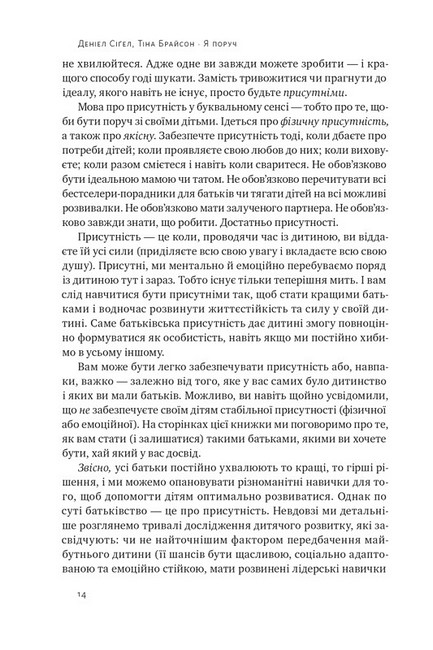 Деніел Сіґел і Тіна Брайсон пропонують компоненти, з яких складається якісна присутність: захищеність, помітність, підтримка і впевненість. У книжці вони докладно розповідають про кожен складник, що допомагає побудувати здорові та приязні стосунки з дитиною й нарешті відчепитися від себе. Адже всі батьки неідеальні, але є ті, що поруч, підтримують, люблять, захищають. І саме вони створюють умови для надійної прив’язаності й здорового розвитку дитини.