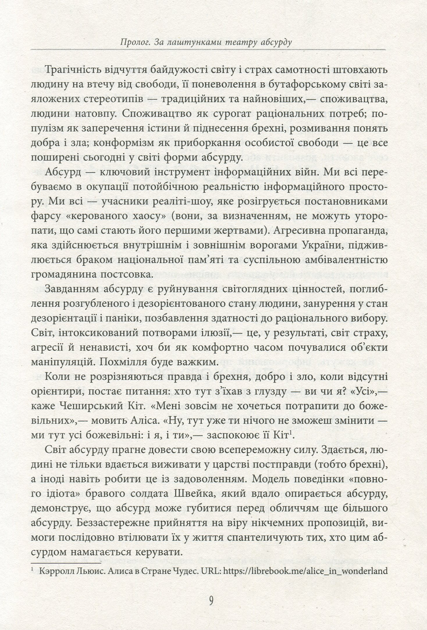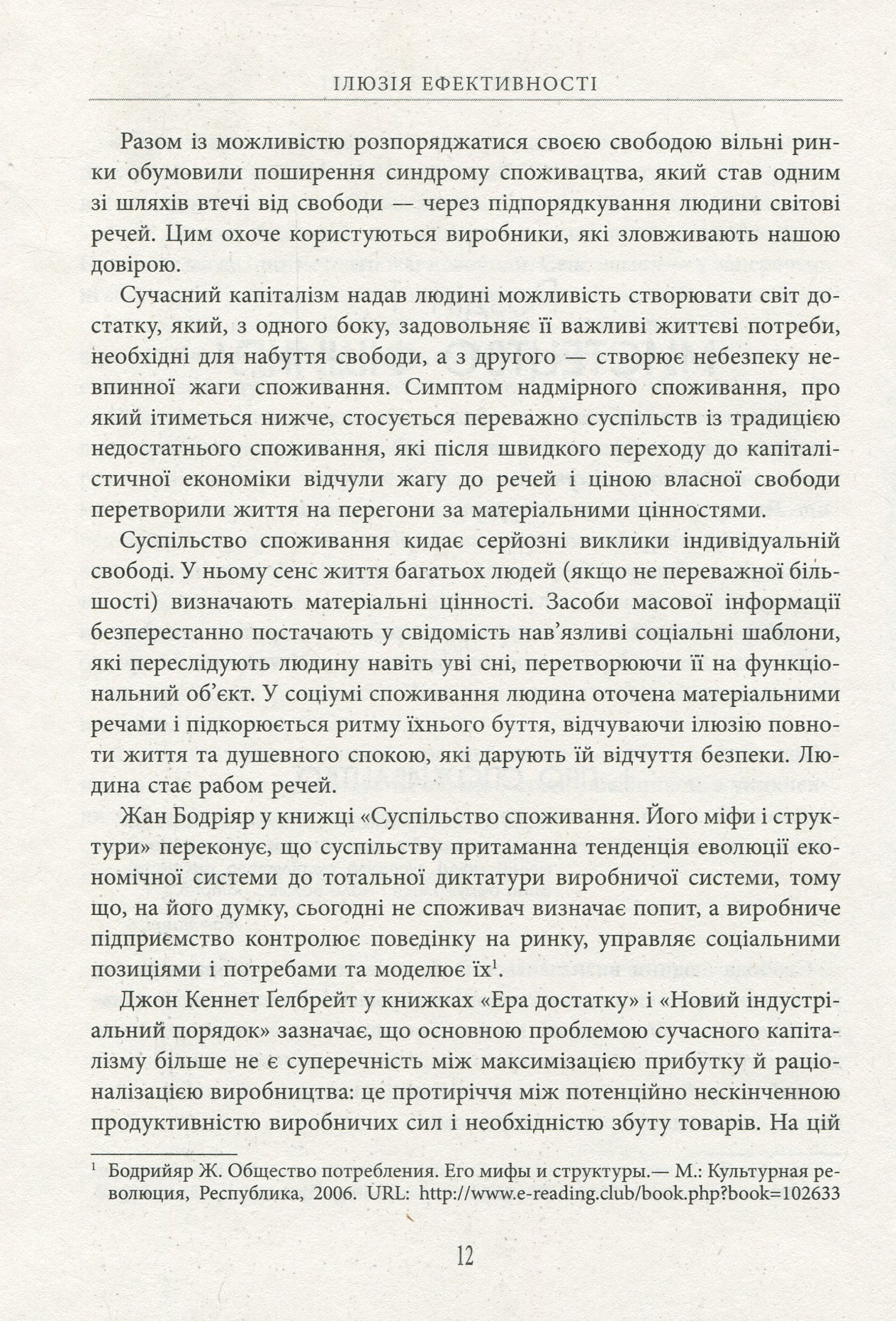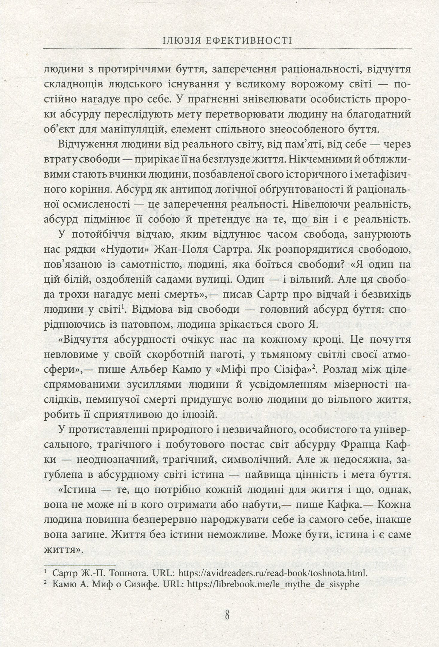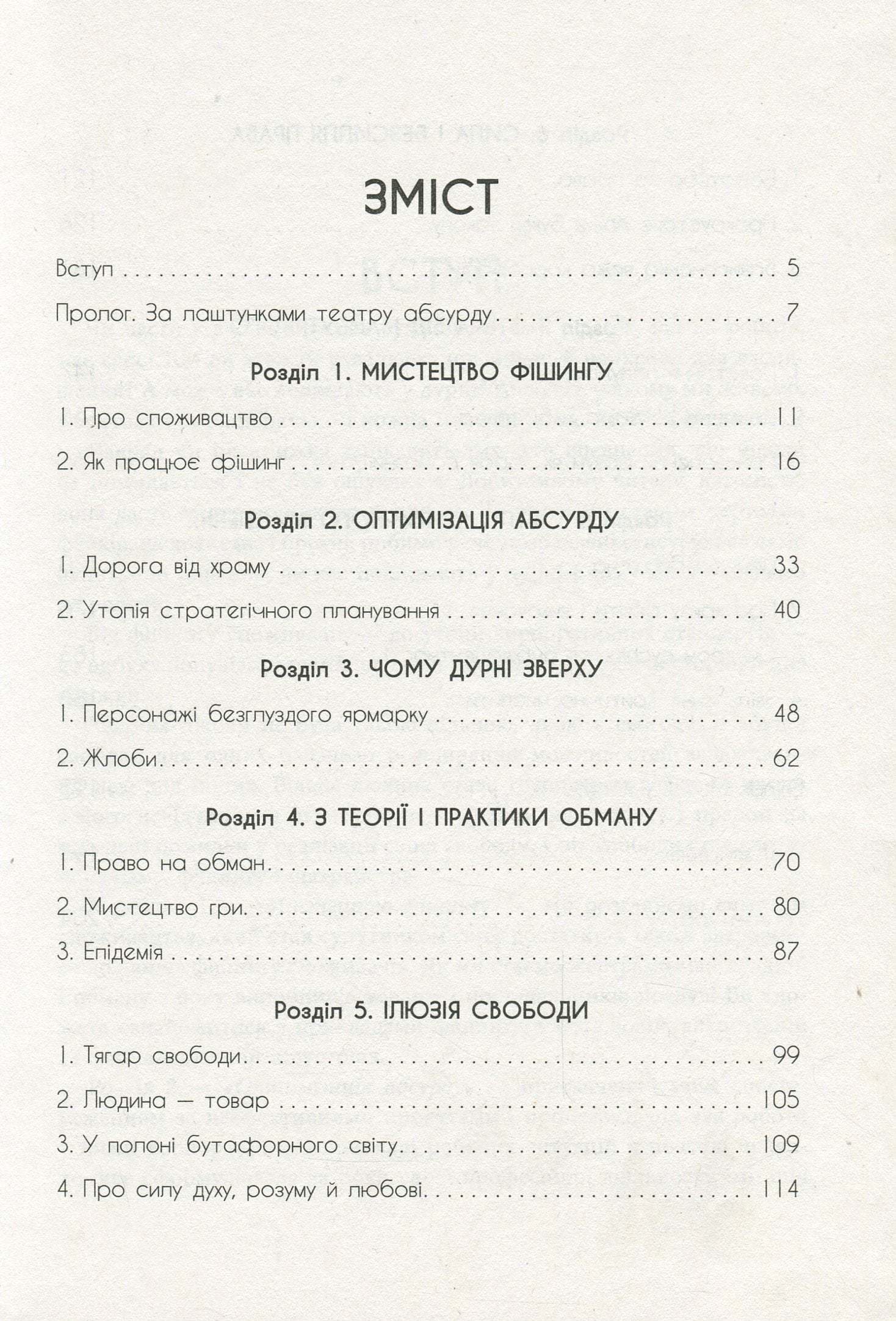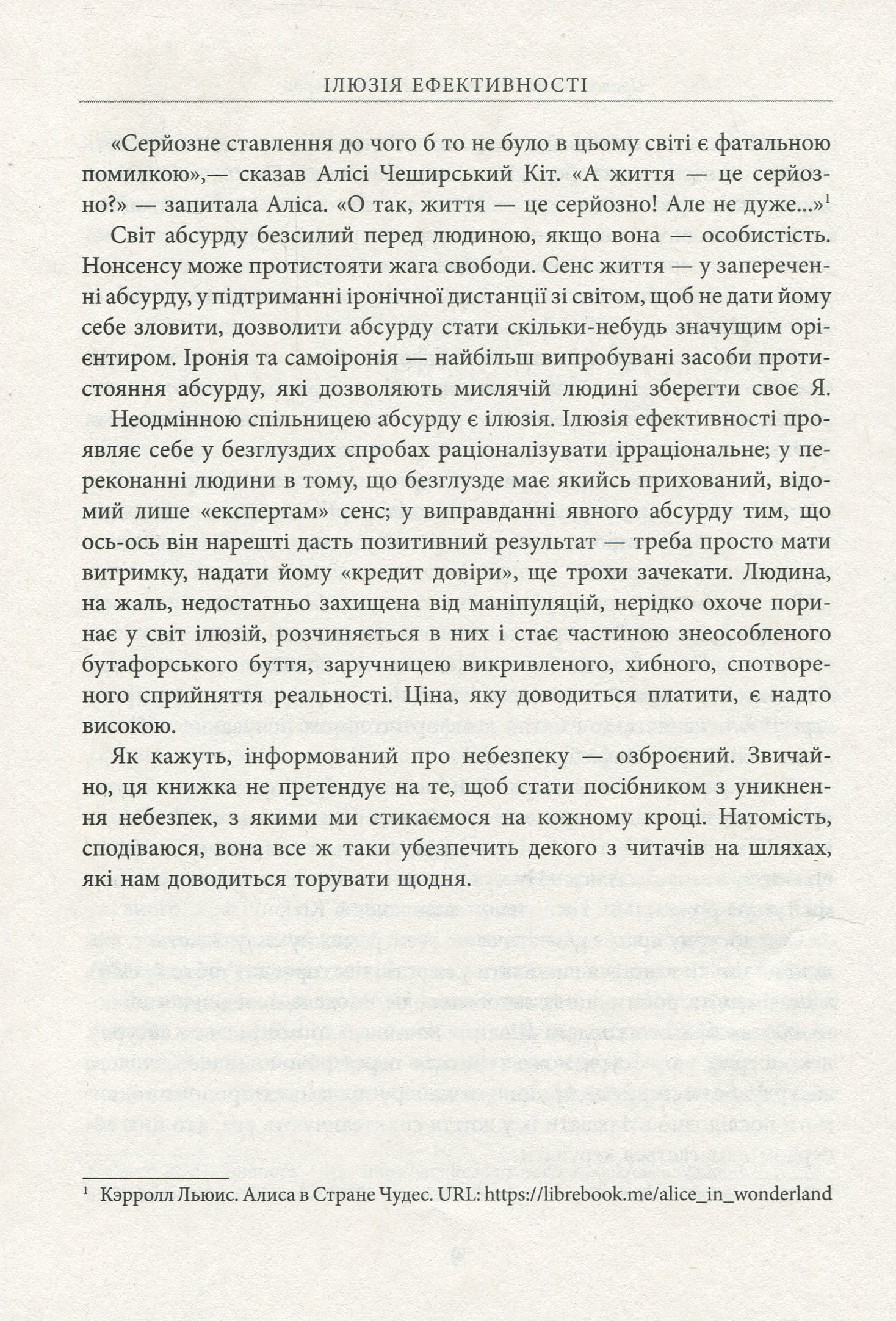 Як ми стаємо жертвами фейків, шахрайства і брехні, робимо безглузді речі, ухвалюємо неефективні або навіть шкідливі рішення? Як нас пошивають у дурні й чому ми дозволяємо це робити? Книжка «Ілюзія ефективності: як і чому нас пошивають у дурні» пропонує читачеві подорож до світу ірраціональності, бутафорії, хаосу, брехні й заперечення реальності. Світу, який воліє знівелювати особистість, перетворити людину на благодатний об'єкт для маніпуляцій. Влада ілюзій і обману як спільниця поневолення розуму людини розглядається авторкою у контексті безглуздя масового споживання товарів та інформації, фішингу в економіці й політиці, кризи суспільства хаосу і пост-правди. Як звільнитися з тенет абсурду, який прагне довести свою всепереможну силу? Як захистити себе від маніпуляцій? Як зберегти відчуття реальності? Ця книга зацікавить того, хто хоч раз у житті ставив під сумнів нав’язані ззовні поширені стереотипи і доцільність усього, що відбувається у нашому «маленькому» і «великому» світах. Хто має відвагу кинути виклик дезорієнтації, хаосу і паніці, спровокованими маніпуляторами. Хто прагне стати на захист дійсного світу всупереч розповсюдженим ілюзіям, з якими ми стикаємося на кожному кроці.