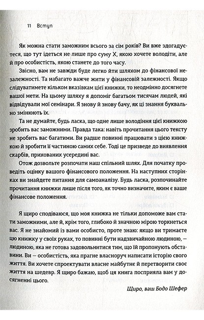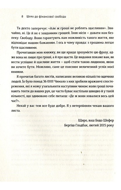 Багатство не падає з неба — звісно, якщо не сподіваєшся попасти під дощ із виграшних лотерейних білетів. Однак завдяки правильній життєвій та фінансовій позиції та довгостроковому плану всі можуть досягнути фінансової безпеки та набути солідного статку, відчутно підвищивши рівень свого життя. Як звільнитися від стереотипів про гроші та заможність? Як уникнути боргів? Як правильно заощаджувати, не забувши про маленькі життєві радості, і як значно підвищити свій дохід? Бодо Шефер ділиться інсайдерською інформацією та розповідає про ефективні методи поводження з грошима, крок за кроком супроводжуючи читача на шляху до його фінансової свободи. Мрієте стати мільйонером за 7 років? Схоже, це цілком реально, варто лише почати вчитися фінансової грамотності, яка хоч і непроста, але цікава наука.