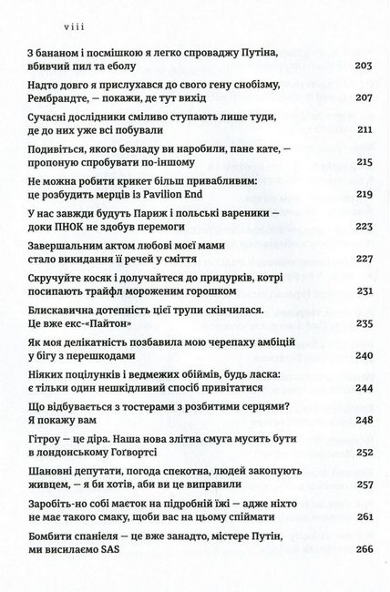 Багато речей, про які тут написано, можуть перевернути ваші уявлення: про саму країну, про її мешканців, про їхній характер і вподобання, ставлення до різноманітних подій, явищ, традицій, спорту, освіти, доброчинності, до Її Величності, одне до одного і навіть до сусідів. Ця книга — портал у неозорий світ щирості, душевної теплоти, зрілого розуму, делікатної — наче родинної — іронії та неймовірного британського гумору. У світ, де жаби співають хором, де небезпека чигає у розмірених водах океанських курортів, де незвичайні речі можна знайти навіть у себе в душовій кабінці, де викладено засади принципово іншої міждержавної політики, а головне — у світ, де над усім панує всепереможний здоровий глузд. У світ за Джеремі Кларксоном.