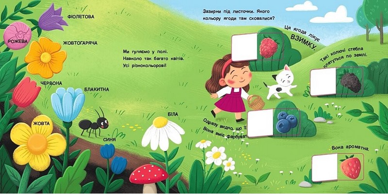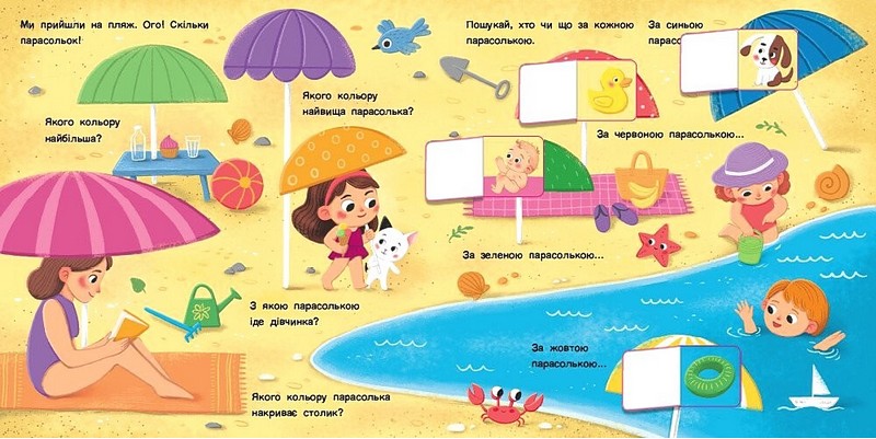 Навколо так багато різних кольорів. Достатньо лиш уважно роззирнутися. Нумо досліджувати кольори навколо! Ми зазирнемо в різні куточки: - погуляємо у полі, - вирушимо у подорож, - відпочинемо на пляжі, - сходимо в океанаріум, - зайдемо у великий іграшковий супермаркет. Ох і цікаві будуть пригоди!