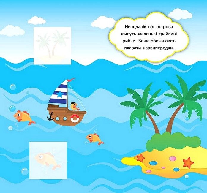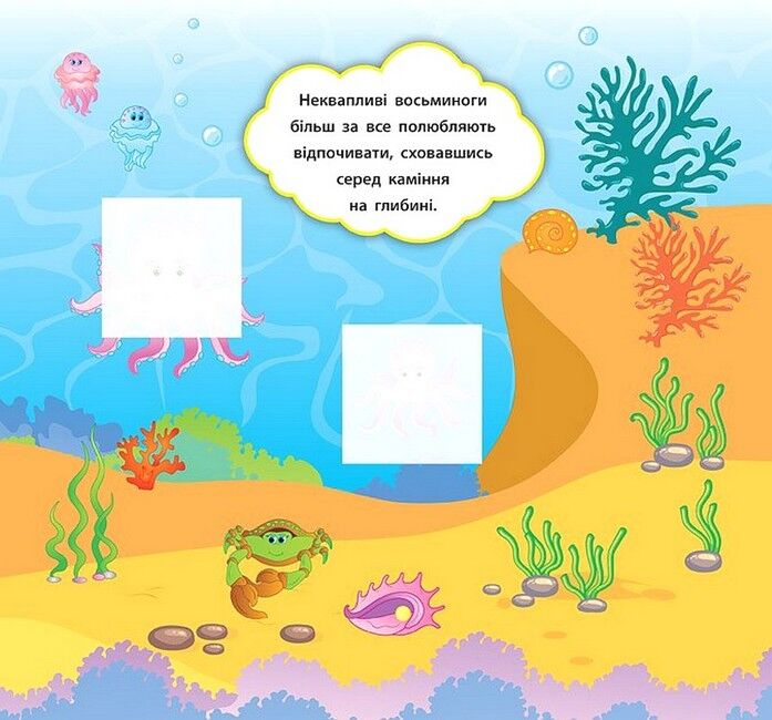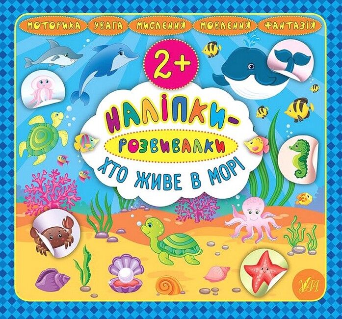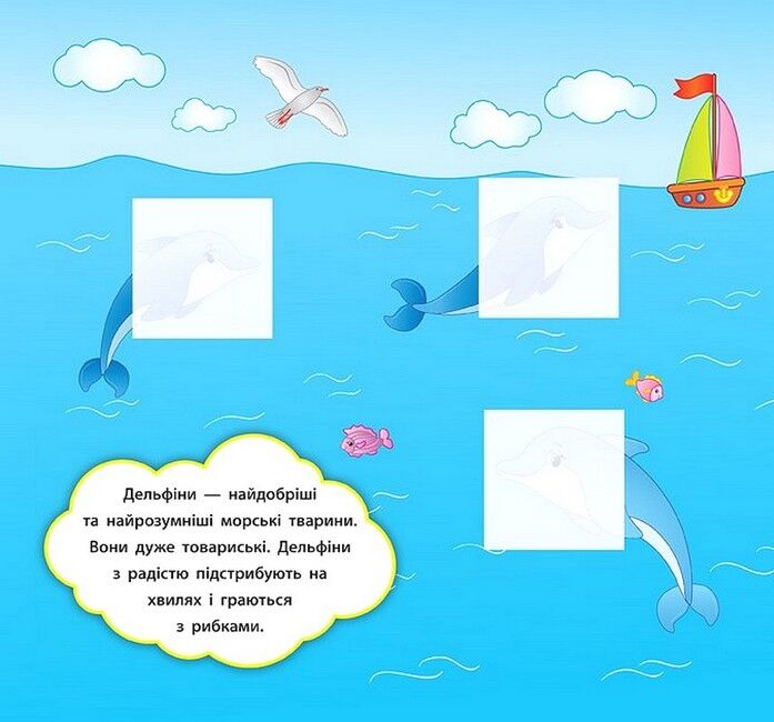 Ця книга познайомить дітей з багатьма мешканцями морів: дельфіном, китом, крабом, морським коником та іншими. Також видання навчить малюків розрізняти поняття цілого та його частини. За допомогою фрагментів-наліпок дитина зможе доповнювати яскраві картинки, а короткі розповіді на кожній сторінці допоможуть батькам зацікавити малюка й стануть гарним поштовхом до створення власних історій. Книга сприятиме розвитку логічного мислення, фантазії, мовлення, уваги та дрібної моторики пальців рук.