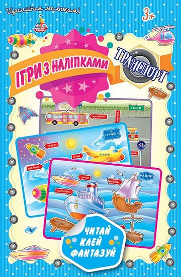 Гра «Транспорт» призначена для малюків віком від 3-х років. До набору входять три кольорові фони та два аркуші з наліпками (зображення транспортних засобів та стрілочки з їхніми назвами). Заповнюючи фони наліпками, дитина: