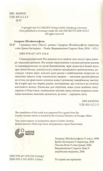 Сімнадцятирічний Філ намагається знайте своє місце серед вихору людських дивацтв. Він шукає порозуміння з ексцентричною мамою та відлюдькуватою сестрою-близнючкою, мріє дізнатися бодай щось про свого батька, закохується в нового загадкового однокласника, досліджує «чорні діри» власної душі разом з найближчою подругою та змалечку чинити опір «маленьким людям» – жителям провінційного містечка, на краю якого хлопець живе у великому занедбаному маєтку. Це історія про всі перше, раннє, несподіване, що стається на початку життєвого шляху. Написана для підлітків, вона стала неабияк популярною в Німеччині, знайшовши серед читачів значно ширшого кола. Адже кожному важливо дізнатися, де вона – середина світу.