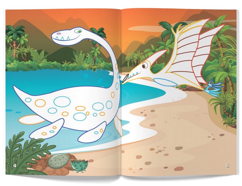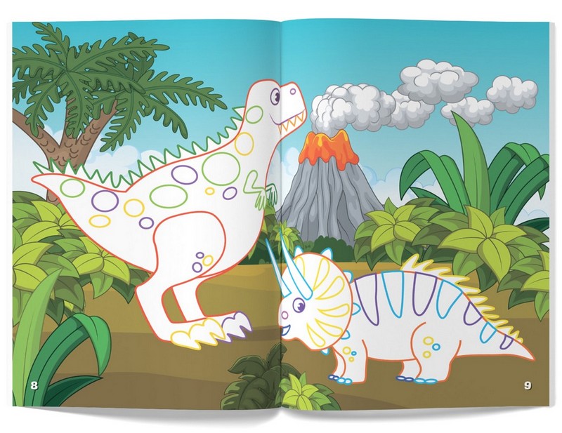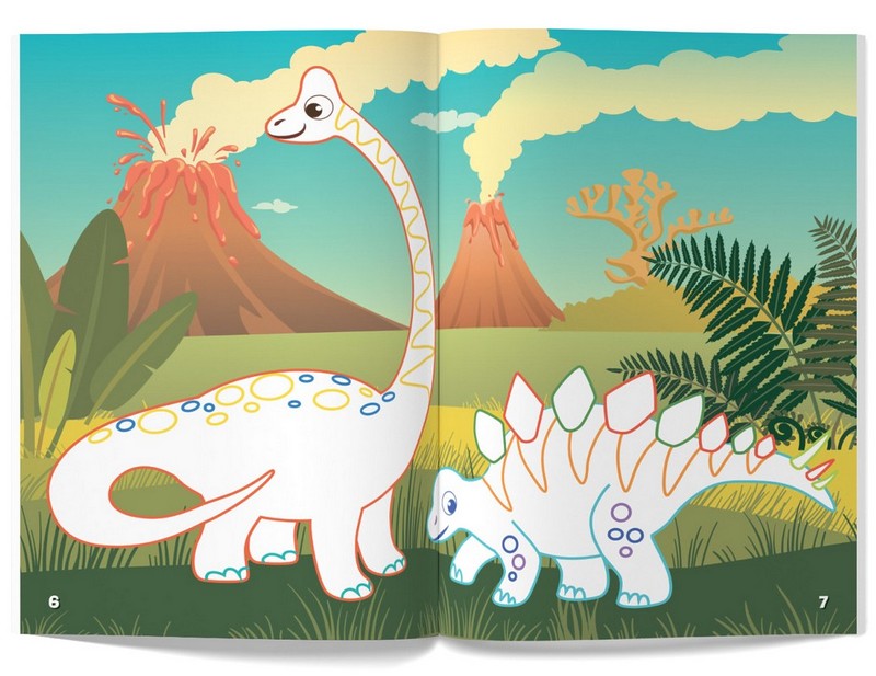 З нашою книжкою будь-який непосидько забуде про витівки й пустощі, адже на нього чекає захопливе заняття — розфарбовування картинок! Кольорові контури підкажуть юному художнику, яку барву потрібно вибрати, а яскраві наліпки допоможуть зробити малюнок ще кращим. Створюючи власні маленькі шедеври, дитина водночас дізнається, як виглядали древні мешканці Землі — динозаври.