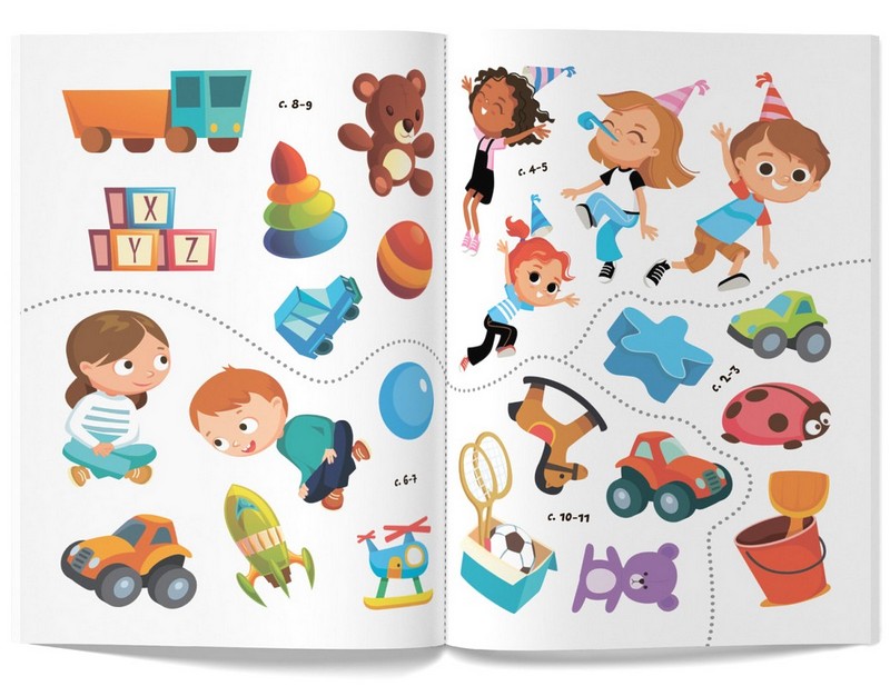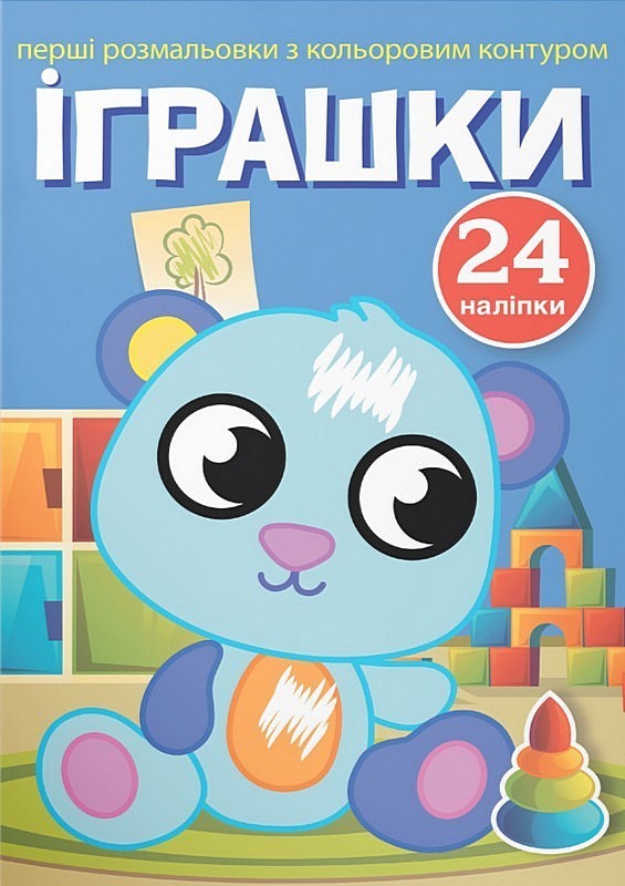Перші розмальовки з кольоровим контуром і наліпками. Іграшки