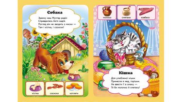 Відкривши її, ваш карапуз дізнається про улюблені ласощі свині, коня, собаки, корови, кішки та інших звірів і птахів, а також про те, що вони не їдять.