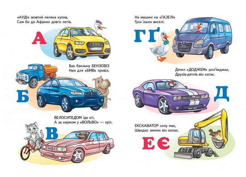 З такою книгою-іграшкою легко зацікавити дитину вивченням абетки — у цьому допоможуть її герої, кумедні звірятка та яскраві машинки. З такими персонажами можна із задоволенням і захопленням вивчати абетку. Ну який автолюбитель і книголюб устоїть перед крутими автомобілями — «Ауді», «БМВ», «Вольво», «Пежо», «Феррарі», «Шевроле» та багатьма іншими?