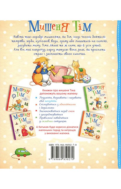 Навіть такі хоробрі мишенята, як Тім, іноді чогось бояться: темряви, юрби, води, грому або лишитись на самоті, загубити маму. Тіма лякає те ж саме, що й усіх дітей. Але він має напрочуд гарну матусю: вона знає, як прогнати страх і заспокоїти свого синочка.