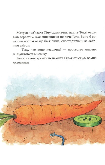 Маленьке мишеня Тім вирішило, що йому не подобається їжа. Він вередує, відвертається від тарілки та вважає, що солодощі набагато смачніші за корисні страви. Але чи можна бути здоровим і сильним, якщо зовсім не їсти? Разом із Тімом діти дізнаються, чому важливо харчуватися правильно та не відмовлятися від корисних продуктів.